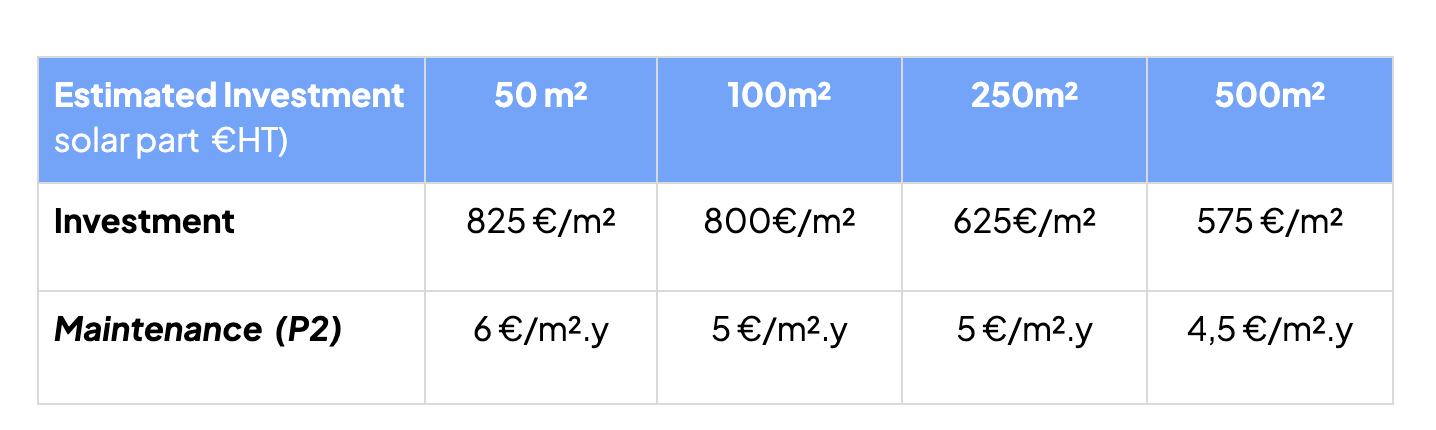 Table showing investment and maintenance ratios for solar installations based on installation size