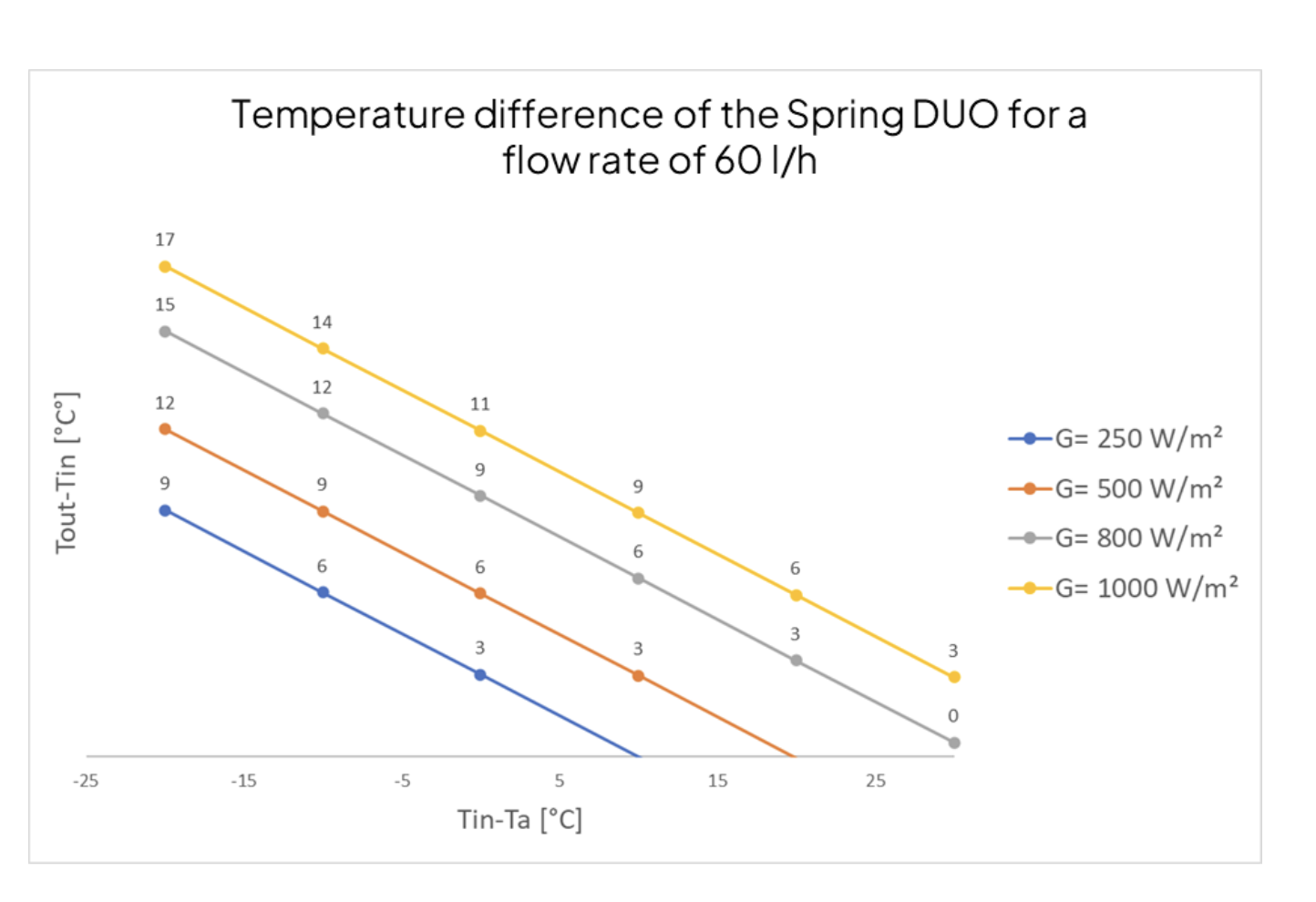 If we consider maximum irradiation of G=1000W/m² and the panel inlet temperature is equal to the air temperature (Tin - Tair = 0°C), then the outlet temperature will be Tout-Tin = 11°C