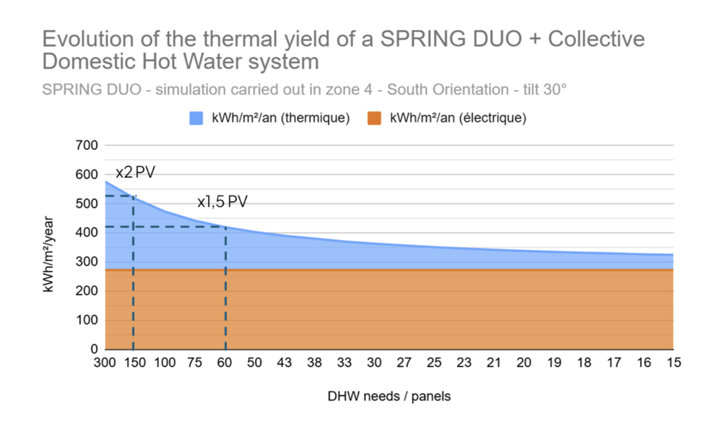 To obtain 2x more energy from a SPRING DUO installation compared to a PV installation, it is necessary to install 1 panel for every 150 L DHW needed per day. This means an average of 1 SPRING DUO panel per flat.
