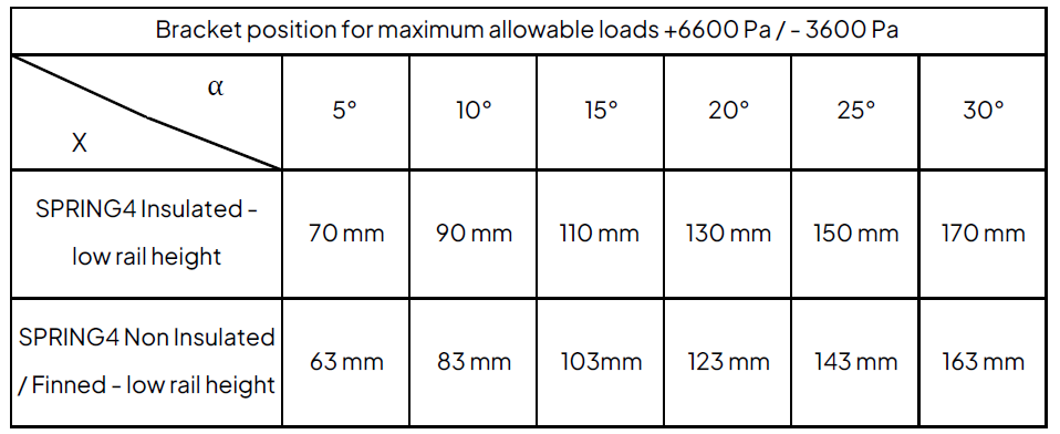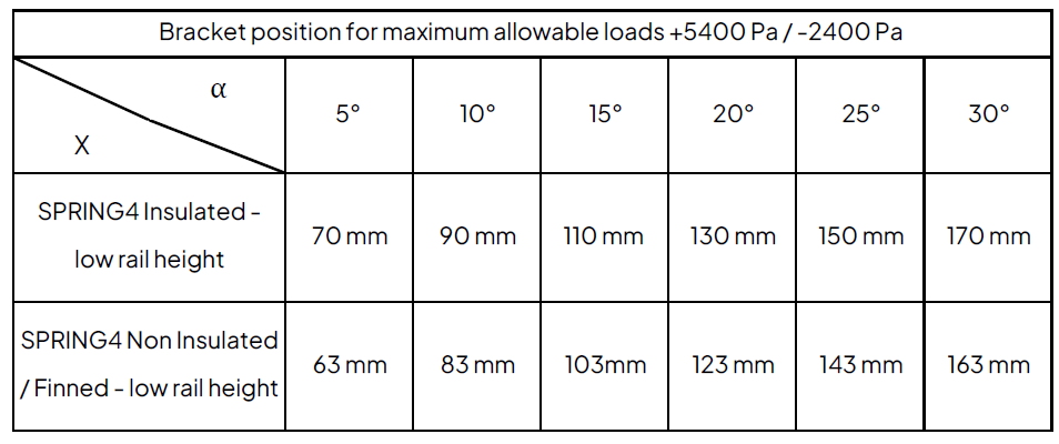 This solution positions the brackets between 294 mm and 394 mm on the long sides of the SPRING4 425. This is a standard bracket installation that ensures the panels hold up well under significant loads from things like snow and wind (+6600 Pa / -3600 Pa).