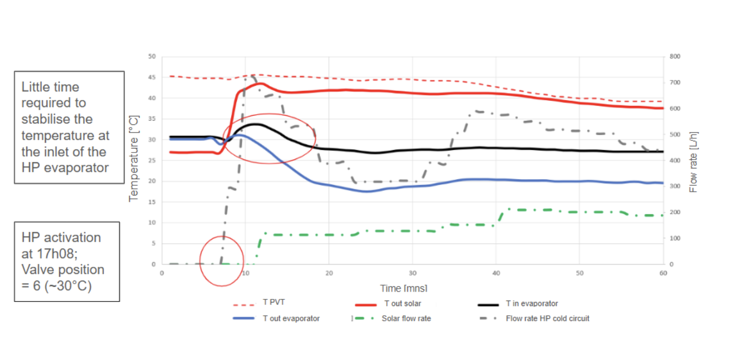 Here is an example of summer operation in Marseille when the temperature of the solar panels was 45°C with a mixing valve setpoint at 30°C. We see that following the activation of the circulator in the collection circuit, the flow in the solar installation is limited by the activation of the mixing valve. This prevented excessively hot temperatures (> 35°C, the valve setpoint) at the evaporator inlet despite a higher temperature measured in the panels.