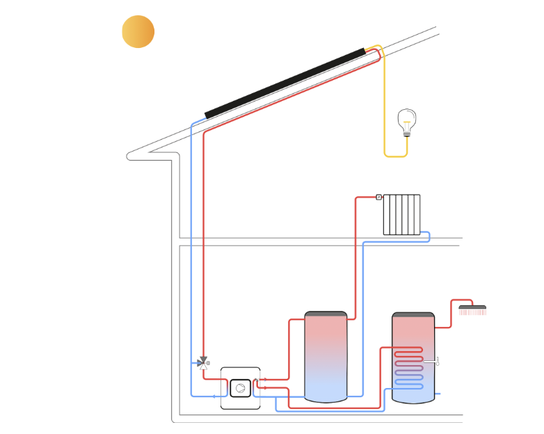 Solar thermal heat pumps operate on the same principle as a geothermal heat pump, i.e. calories are drawn from the environment (via solar panels here) and transported via a heat transfer fluid to supply the heat pump's evaporator.