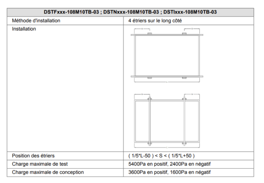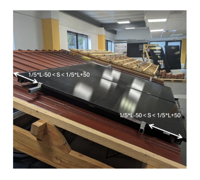La position des étriers doit donc être située entre 294,4 mm et 394,4 mm par rapport à l'extrémité du long côté pour le SPRING 425. Ce montage permet d’installer simplement les SPRING4 sans se soucier des manifold contrairement au montage paysage des panneaux SPRING4 sur bac acier.